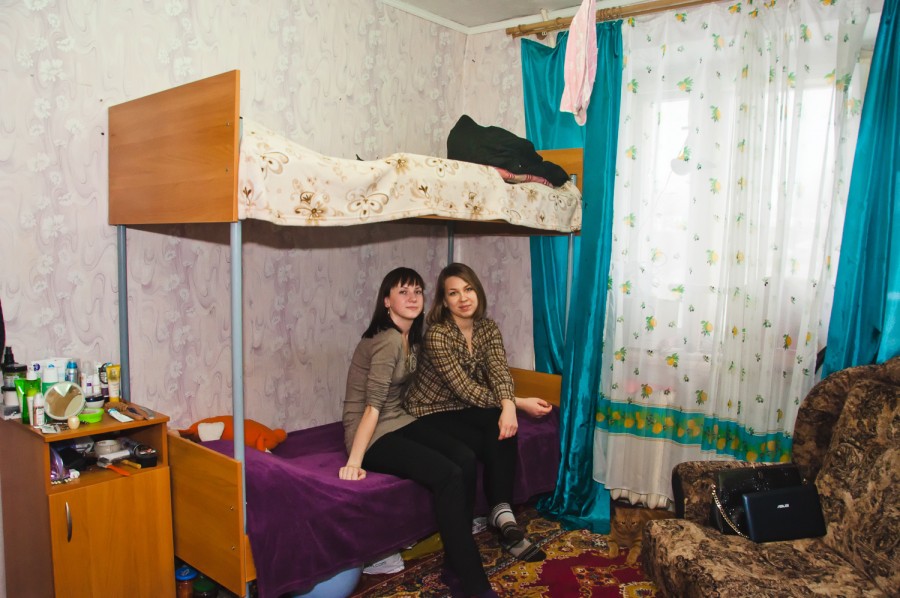 De kamer van Masja en Zina bevindt zich op de zevende etage. In principe is er een lift, maar deze werkt al jaren niet meer. Dus gaan we met de trap. Elke etage bestaat uit een lange gang met aan beide kanten deuren die naar de slaapkamers leiden. Masja en Zina hebben geluk, zij slapen maar met twee personen op een kamer. In andere gebouwen delen studenten een kamer met vier personen. Ook hebben Masja en Zina het voordeel dat ze vrienden zijn: ‘Je mag je eigen kamergenoot niet zelf uitzoeken, dus het is altijd afwachten met wie je op een kamer belandt. Je kunt je voorstellen wat voor ruzies daar uit kunnen ontstaan’, vertelt Masja.